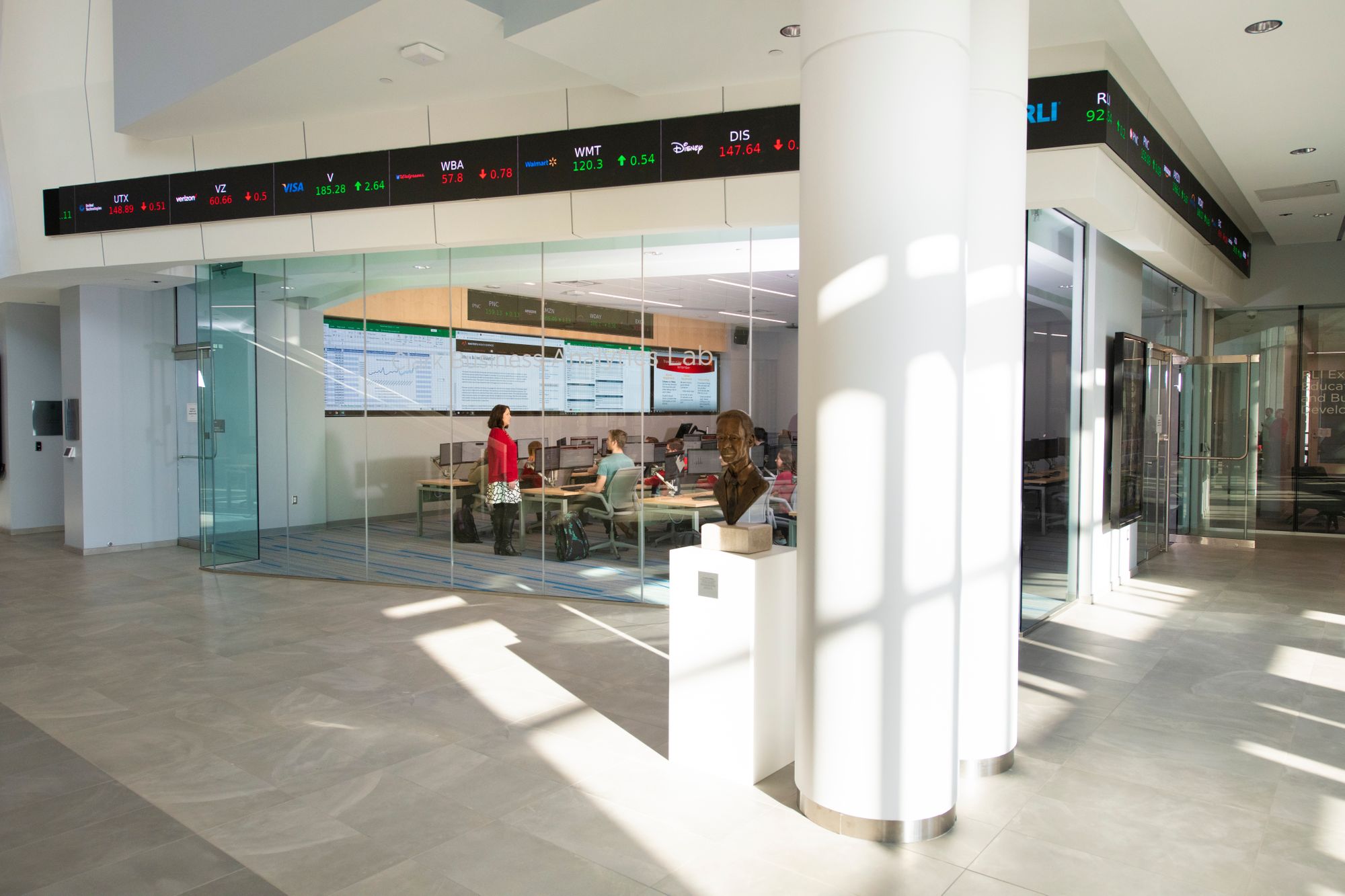 We stayed in touch for a while as their team had quite the task ahead of them. They had to source materials and bring this vision to life. A few short weeks later, this beauty was revealed. Live and functioning, the newly installed ticker-tape display serves as the showpiece on the main level of Bradley’s new Business and Engineering Convergence Center. With such a simple design, it curves around the entire lab, elegantly displaying daily stock prices and quotes.