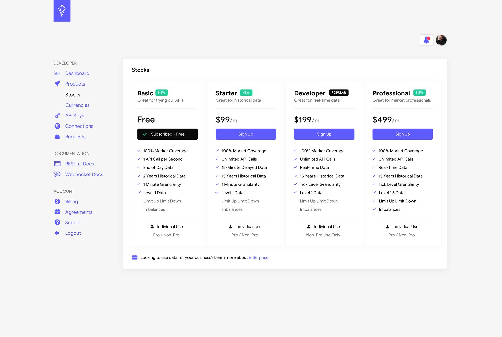 Free data tiers allow developers to sign up and start using our APIs instantly. No credit card required. Starting today all accounts will have access to end of day U.S. equities, forex, and crypto data, including 2 years of historical data at minute level granularity - for free.