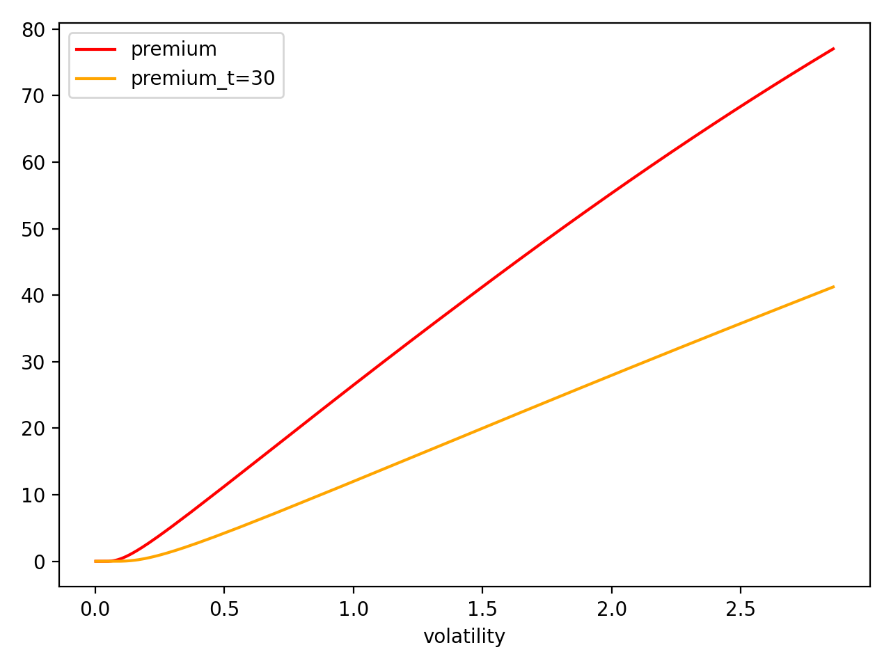 As we can see in the very simple graph above, volatility and premium are almost linearly related. The higher the volatility, the greater premium demanded for the option. Note that other factors such as the spot price (price of the underlying stock), interest rates, and the passage of time can affect this curve. For example, if the time to maturity was instead 30 days, the chart would look like this: