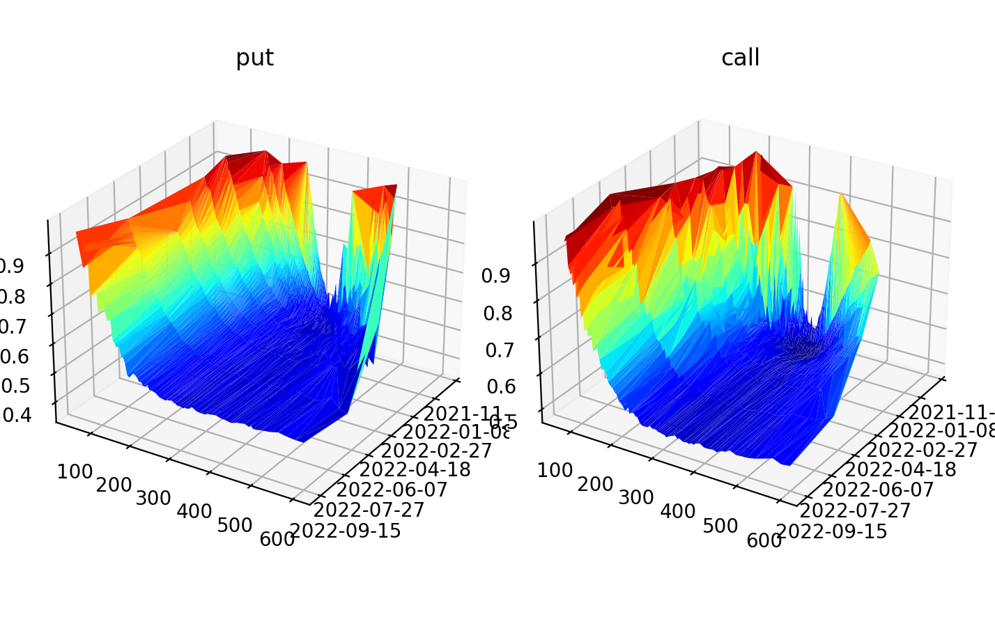 While volatility can be said to be a property of the underlying asset, implied volatility depends on the parameters of the option contract, particularly the expiration date and the strike price. This gives rise to an implied volatility surface, where implied volatility varies with respect to time to maturity and strike price: