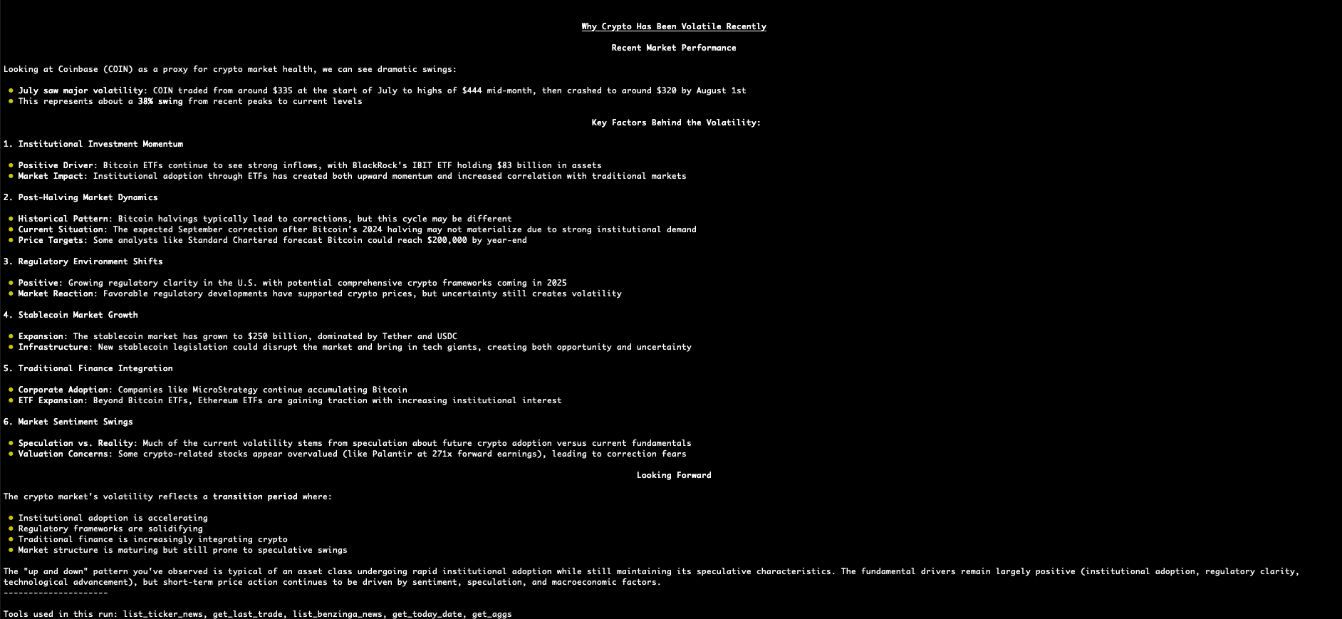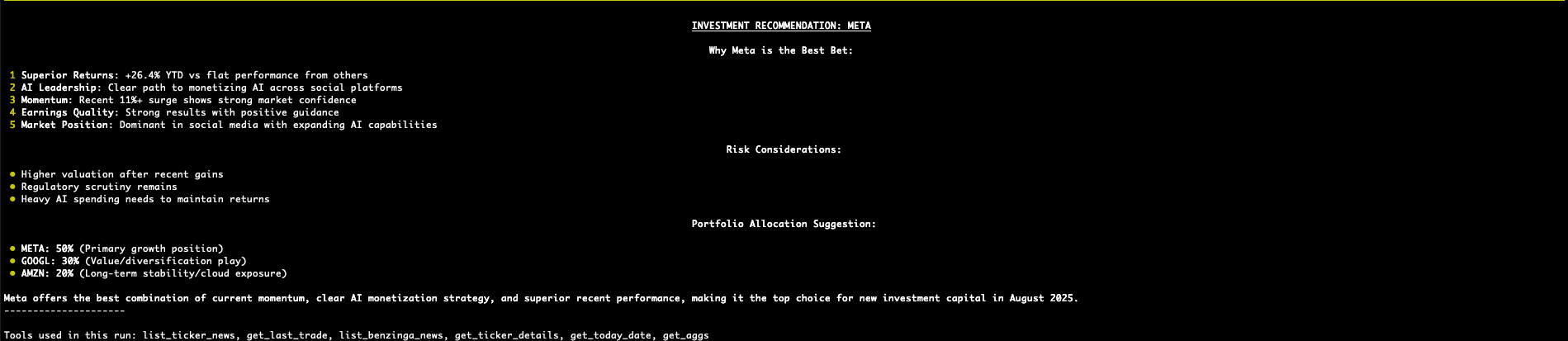 Thanks to the convergence of high-fidelity data, powerful AI models, and modern development frameworks, this is now possible. This tutorial will walk you through building a simple but powerful AI financial analyst. We'll use a stack that combines Polygon.io's real time market data (via the Polygon.io MCP server) with the reasoning capabilities of Anthropic's Claude 4, all tied together with the Pydantic AI agent framework.