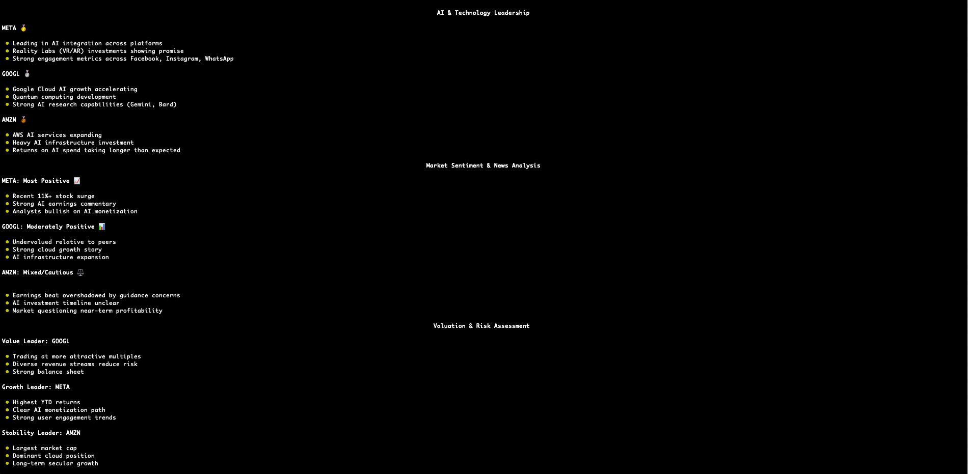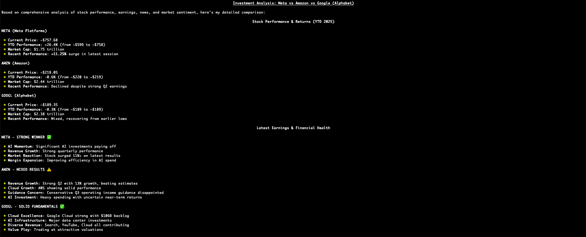 Consider an investment between Meta, Amazon, and Google. Which one is the best bet based on returns, earnings, latest news, and market sentiment