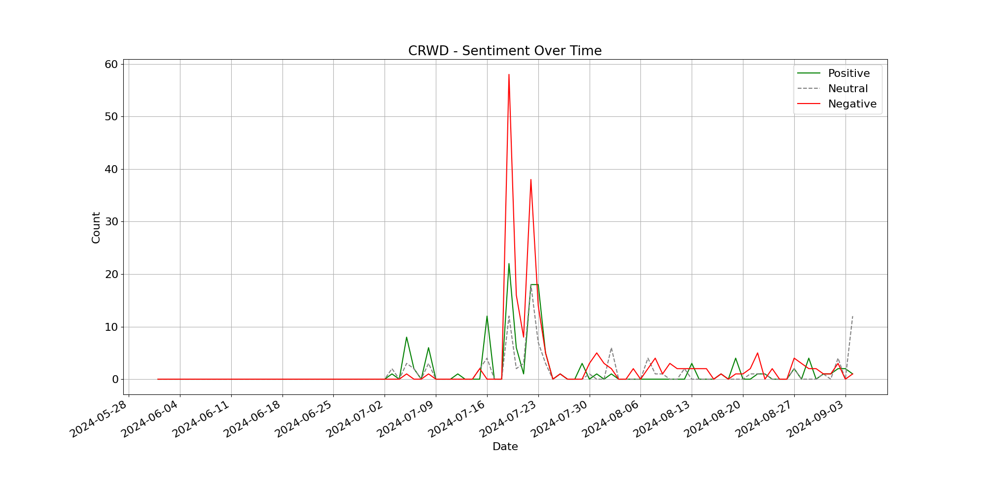 For CrowdStrike, the graph displays a significant spike in negative sentiment following the global outage caused by a software update. This visual highlights the immediate and substantial increase in negative press, reflecting the severity of the impact across multiple industries.