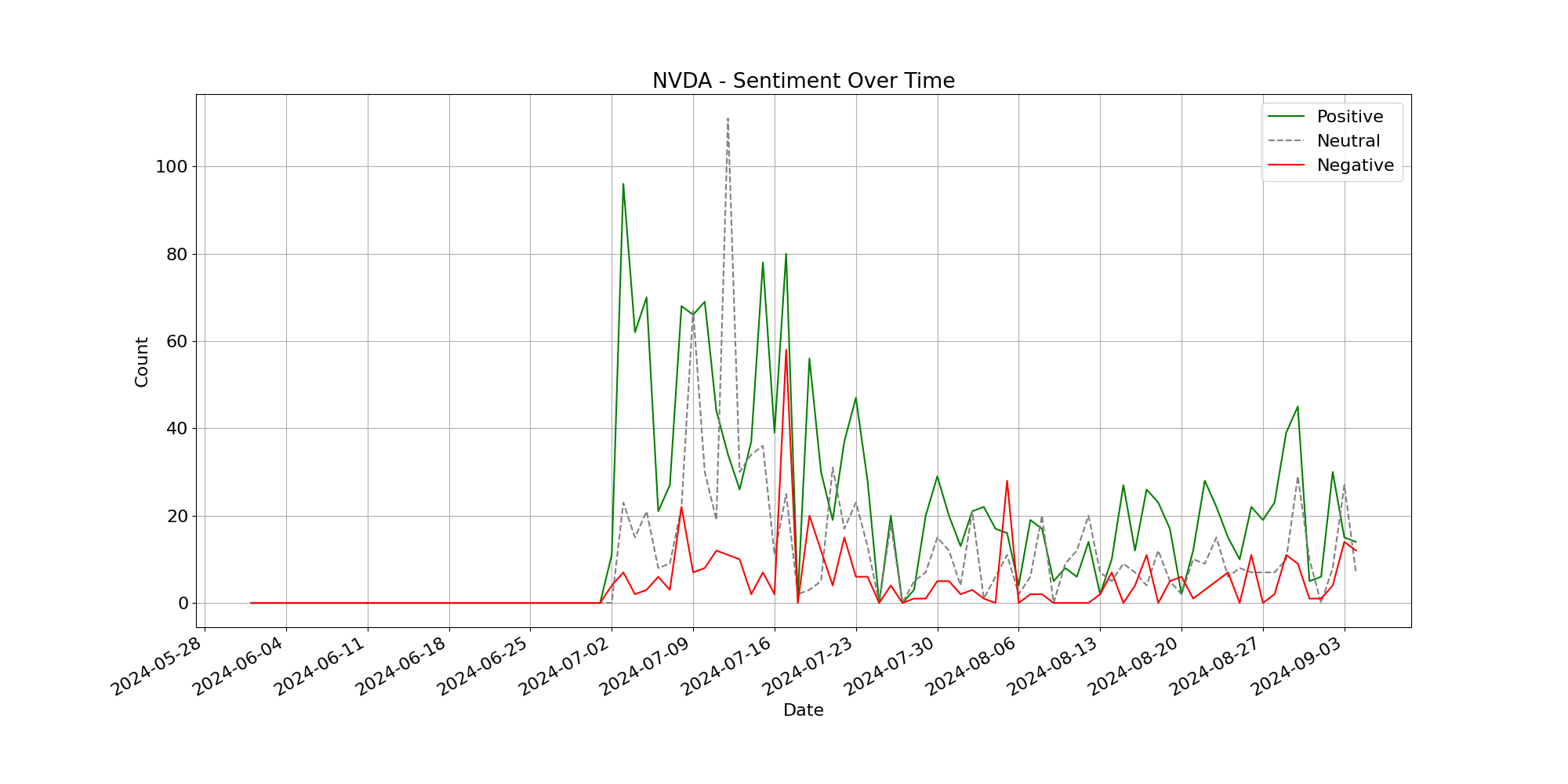 In contrast, the graph for NVIDIA illustrates a sustained increase in positive sentiment over an extended period, coinciding with the company's advancements in AI technology. This trend underscores the favorable media coverage that NVIDIA has received, bolstered by its pivotal role in driving AI innovations.
